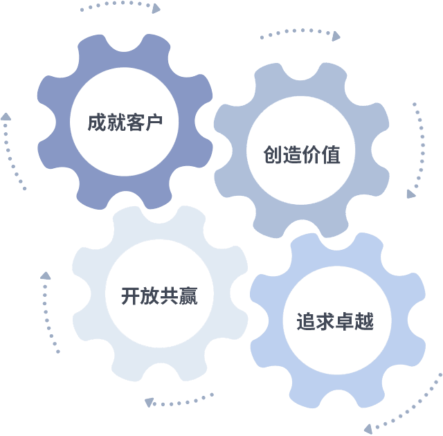 成就客户是一切决策的出发点,,,,创造价值是衡量所有工作的标准,,,追求卓越是我们做事做人的态度,,,,开放共赢是我们的格局也是最终的结果。。。价值观的齿轮环环相扣,,推动着组织里的每个人不断向前。。